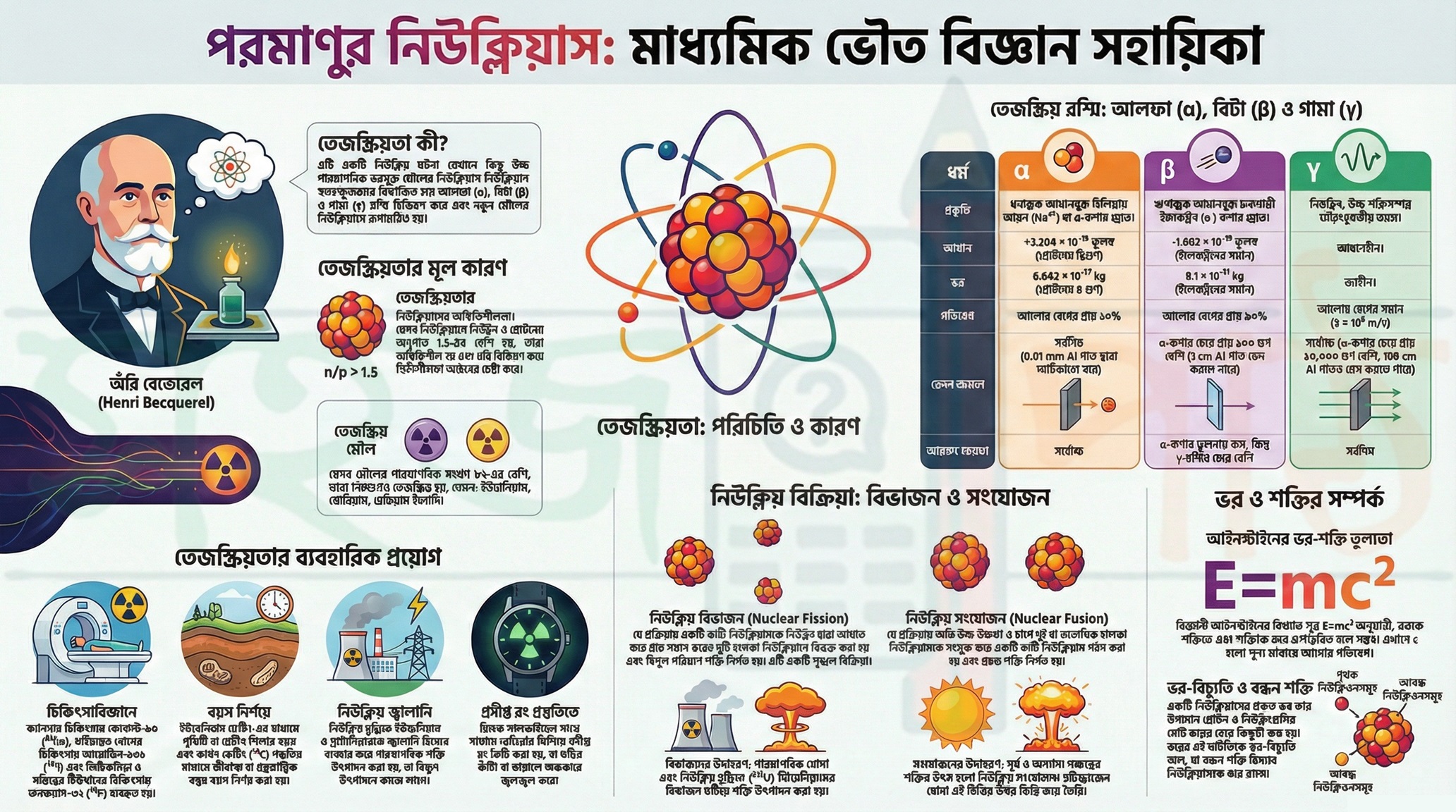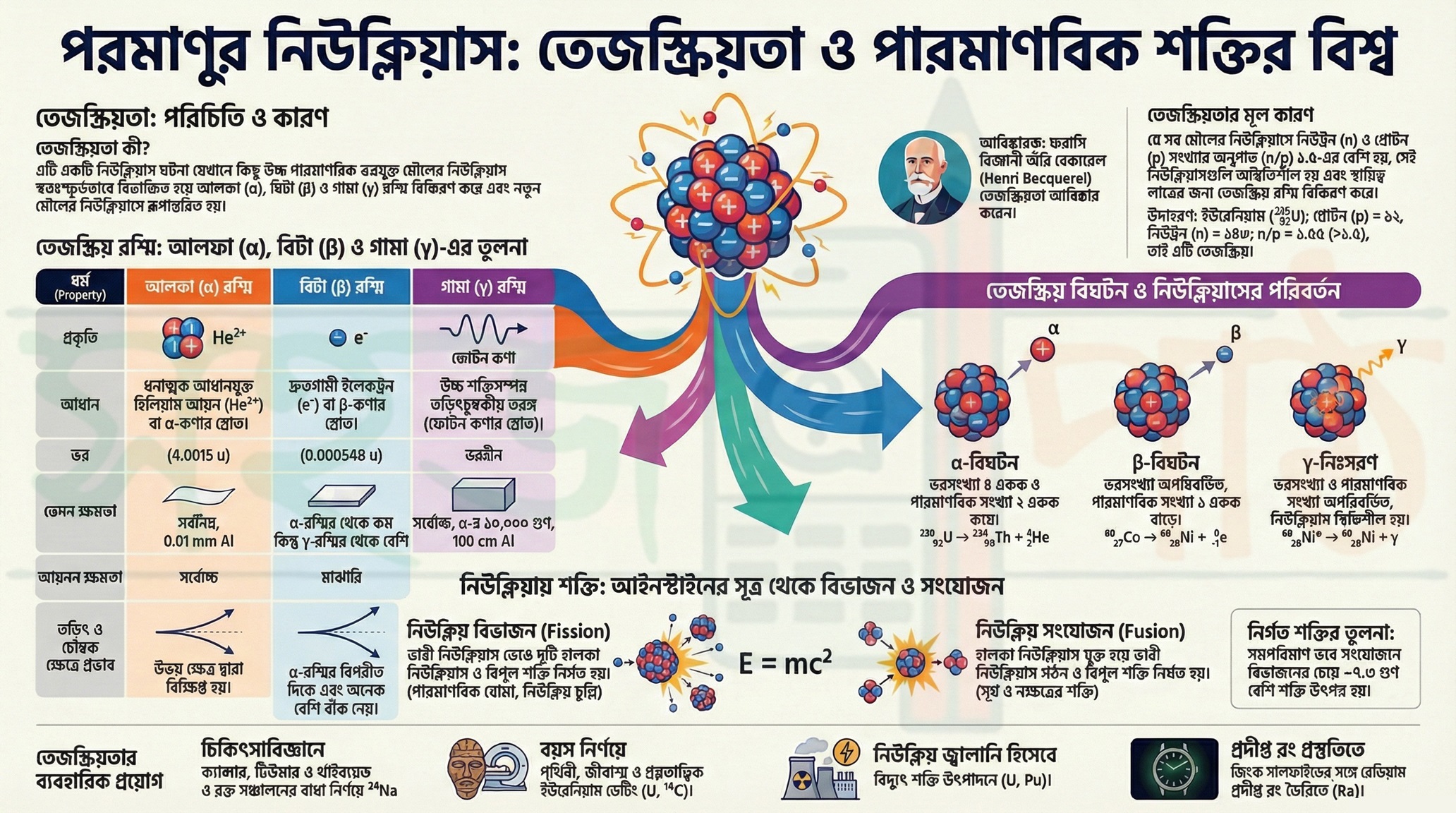 প্রতিটি পদার্থের মূল গঠন একক হলো পরমাণু, যার কেন্দ্রে রয়েছে একটি ক্ষুদ্র কিন্তু অত্যন্ত ভরযুক্ত অংশ, যা নিউক্লিয়াস নামে পরিচিত। এই নিউক্লিয়াস প্রোটন এবং নিউট্রন নামক দুই ধরনের কণা দ্বারা গঠিত। একটি পরমাণুর রাসায়নিক পরিচয় তার প্রোটন সংখ্যার উপর নির্ভর করলেও, নিউক্লিয়াসের স্থায়িত্ব নির্ভর করে প্রোটন ও নিউট্রনের সংখ্যার ভারসাম্য এবং তাদের মধ্যকার শক্তিশালী বন্ধনের উপর। অধিকাংশ পরমাণুর নিউক্লিয়াস স্থায়ী, কিন্তু কিছু ভারী মৌলের নিউক্লিয়াস প্রাকৃতিকভাবেই অস্থিতিশীল হয়। এই অস্থিতিশীল নিউক্লিয়াসগুলো যখন স্থায়িত্ব খোঁজে, তখন তারা স্বতঃস্ফূর্তভাবে কিছু কণা বা রশ্মি বিকিরণ করে—আর এই প্রাকৃতিক ঘটনাই হলো তেজস্ক্রিয়তা। তেজস্ক্রিয়তার আবিষ্কার পারমাণবিক পদার্থবিজ্ঞানের জগতে এক নতুন দিগন্ত উন্মোচন করেছে এবং মানব সভ্যতাকে পারমাণবিক শক্তির অফুরন্ত উৎসের সন্ধান দিয়েছে।